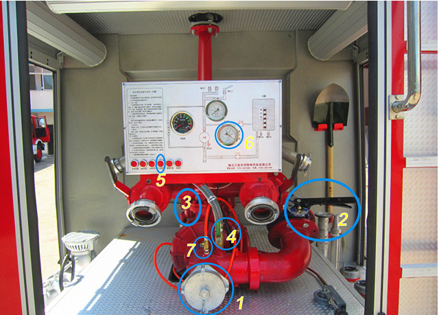 打開車輛總電源→打開車輛取力器→打開后進水按鈕→打開常規(guī)出口任意一個或兩個→接水帶→打水
