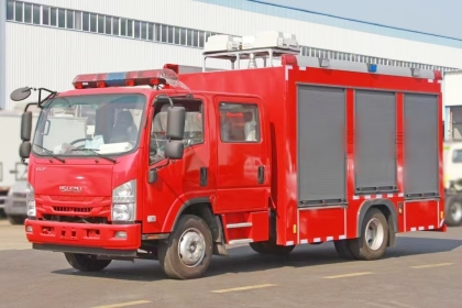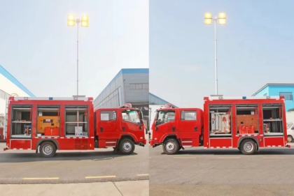 駕駛室頂部前端為長排警燈,車身后配有24V/60W火場照明燈一只,車輛兩側(cè)上方各配有紅藍(lán)相配的爆閃燈,下方安裝安全標(biāo)志燈,乘員室、器材箱、 泵房內(nèi)均裝有照明燈,加裝有100W警報(bào)器,回轉(zhuǎn)警燈開關(guān)、通訊設(shè)備預(yù)備接口。