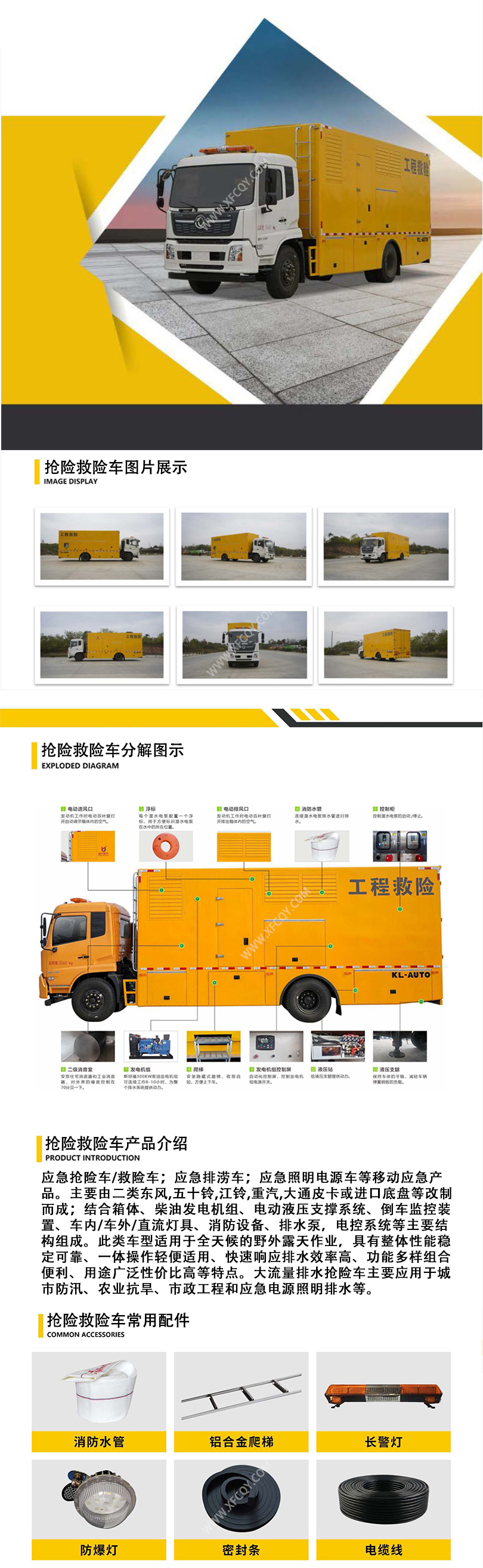1.該車主要用于應急搶險救援,主要專用裝置為發(fā)電機、設備柜;2.隨原車選裝鋁輪、輪罩;3.選用發(fā)動機最大凈功率為130kw,ABS型號:YF8,生產(chǎn)企業(yè):武漢元豐汽車電控系統(tǒng)股份有限公司;4.后橋速比為4.875時,最高車速為120km/h;后橋速比為4.1時,最高車速為140km/h;5.選裝直接供電式ETC車載裝置;6.該車配備汽車事件數(shù)據(jù)記錄系統(tǒng)(EDR);7.照明燈僅駐車作業(yè)狀態(tài)下使用.